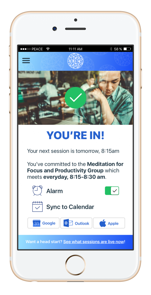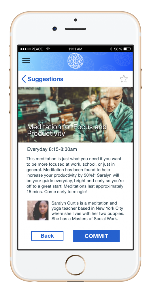 Below are some screens taken to high fidelity post-project. These screens show the screens after inputting user goals/needs. Users are shown meditation groups that meet their needs the best; users can get more information about the sessions; and lastly, once users commit (using some stronger language there!), alarms are added, and the sessions are synced to their calendars.